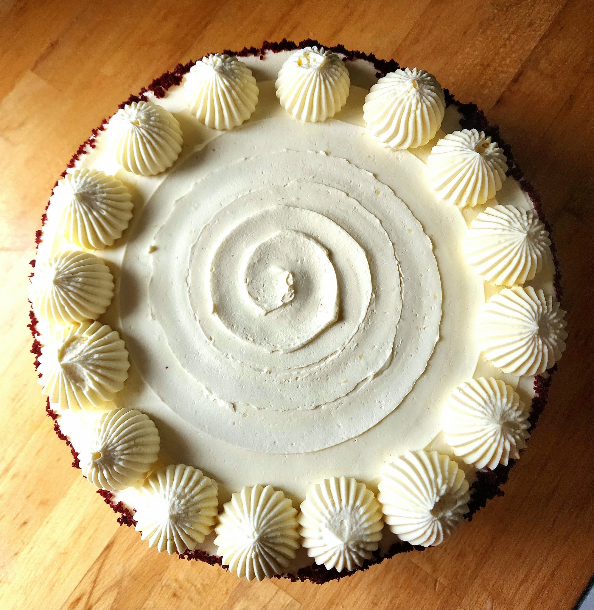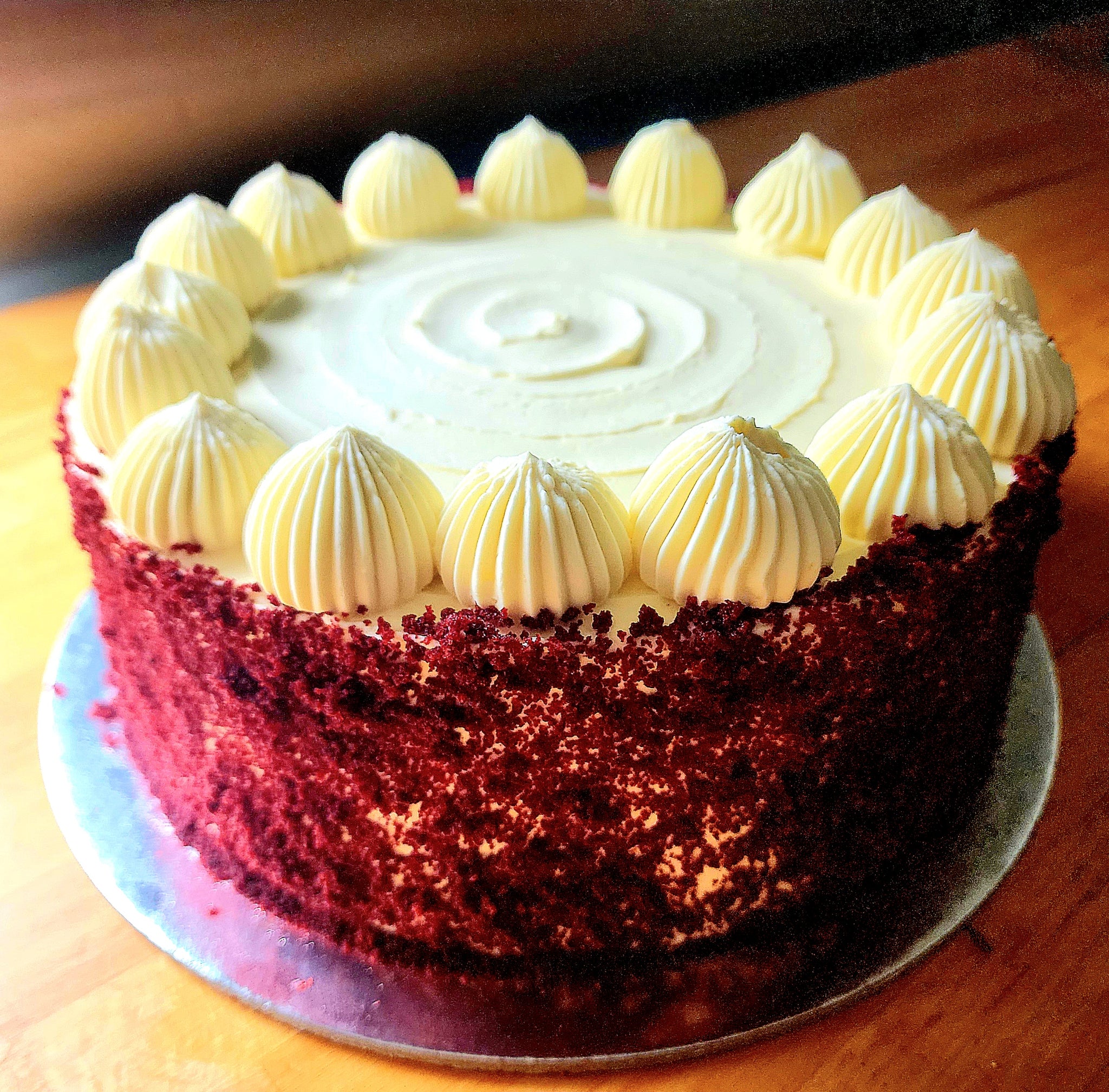 Soft, smooth, tender and light red velvet cake (very mild cocoa flavour with a slightly tart edge) filled and iced with creamy cream cheese buttercream .